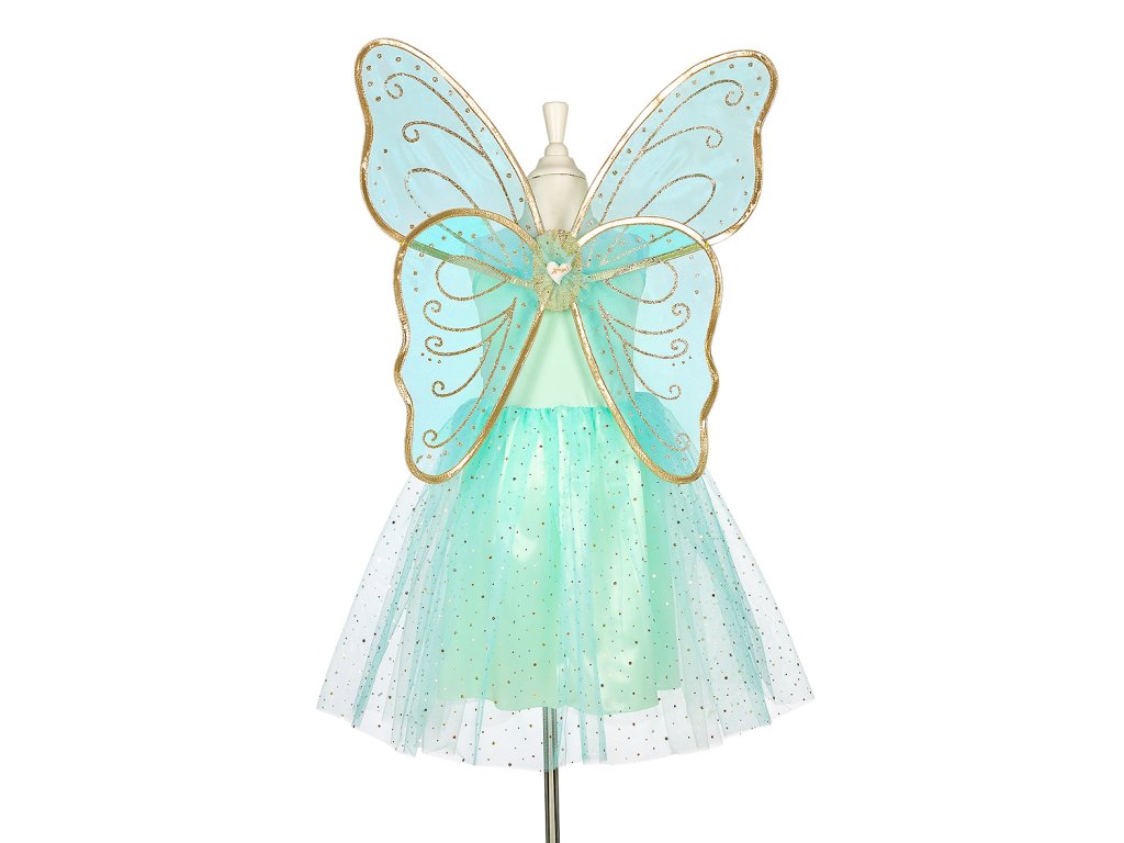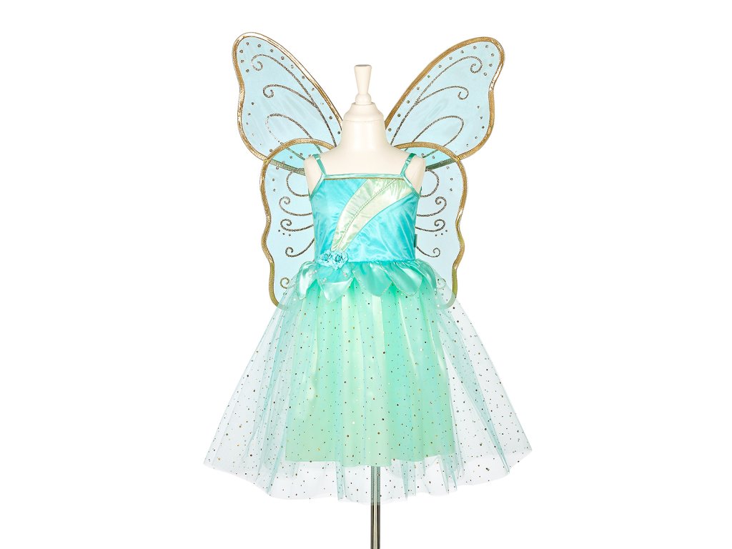 Originálne a dokonale spracované šaty pre malú vílu. Tyrkysové šaty s motýlími krídlami sú krásne a zároveň pohodlné. Majú klasický strih s nastaviteľnými ramienkami a elastickým pásom, vďaka čomu sa ľahko obliekajú cez hlavu a pohodlne nosia. Prednú časť šiat zdobí zlaté prešívanie a trblietavá aplikácia. Pás doplňujú dve jemné kvety a lístky so zlatým okrajom, ktoré dodávajú šatám rozprávkový vzhľad. Sukňa je tvorená saténovým základom s vrstvou svetlotyrkysového tylu posiateho zlatými bodkami. Súčasťou kostýmu sú priesvitné tyrkysové krídla so zlatými vzormi a zlatým lemovaním. Krídla sa pohodlne nasadzujú pomocou pružných gumičiek s látkovým lemovaním a možno ich nosiť i samostatne. Tento kostým víly je ako stvorený pre karneval, oslavy narodenín, tematické fotenie alebo len tak na hranie doma. Je to ideálny darček pre malé milovníčky fantazijných svetov.