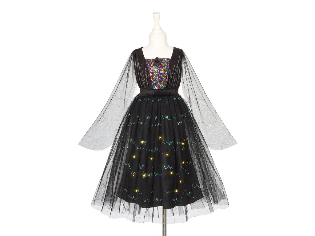Kúzelný kostým pre každú malú čarodejnicu. Keď sa čarodejnica Agatha vznáša na nočnej oblohe, jej sukňa svieti ako hviezdy. A tieto šaty to skutočne vedia – majú totiž v sukni schované malé svetielka, ktoré svietia v tme. Šaty sú ľahké, pohodlné a ľahko sa obliekajú. Skvelé na karneval, čarodejnícky zlet, narodeninové oslavy alebo len tak na hranie doma.