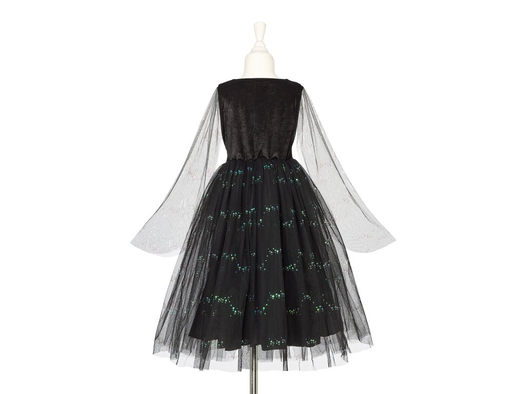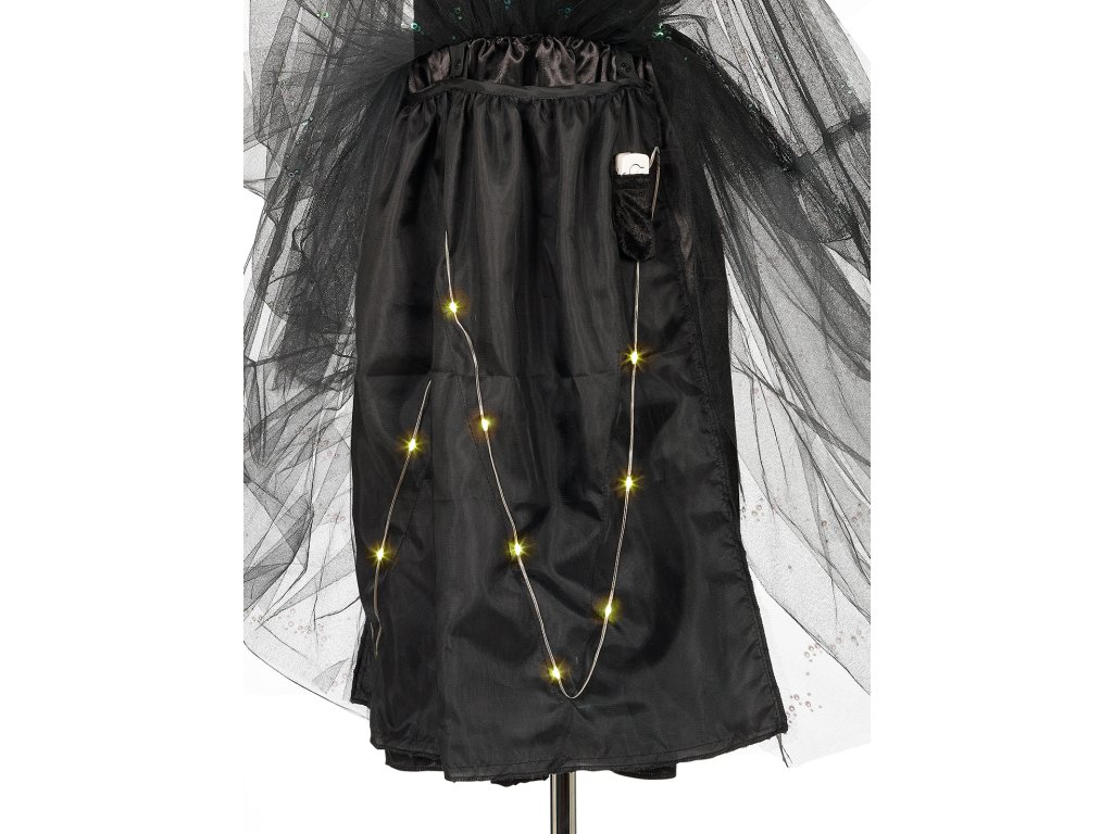 Kúzelný kostým pre každú malú čarodejnicu. Keď sa čarodejnica Agatha vznáša na nočnej oblohe, jej sukňa svieti ako hviezdy. A tieto šaty to skutočne vedia – majú totiž v sukni schované malé svetielka, ktoré svietia v tme. Šaty sú ľahké, pohodlné a ľahko sa obliekajú. Skvelé na karneval, čarodejnícky zlet, narodeninové oslavy alebo len tak na hranie doma.