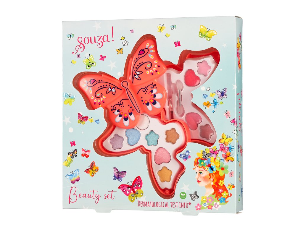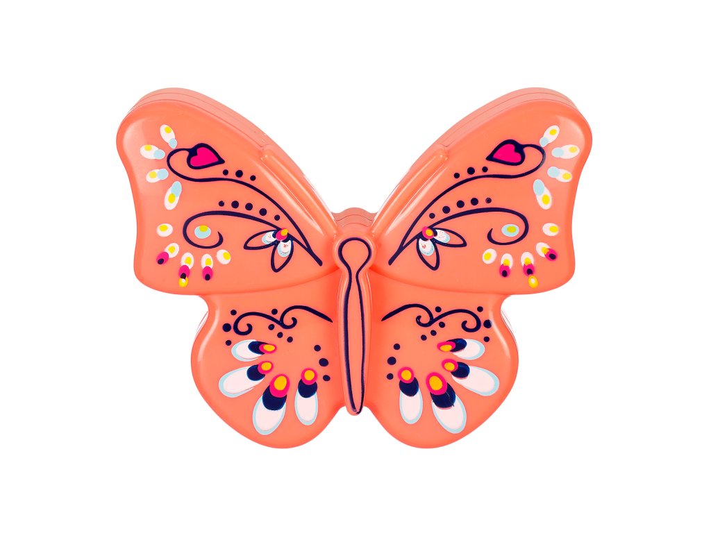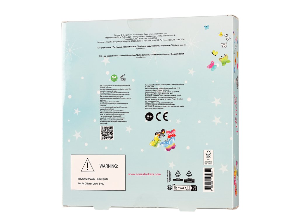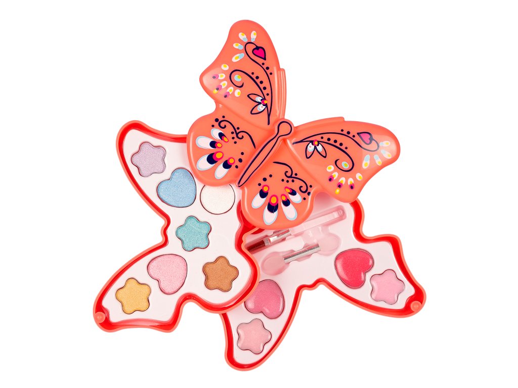 Súprava s detskou kozmetikou v okúzľujúcom dvojposchodovom puzdre v tvare motýľa pre malé parádnice od 6 rokov. Súprava obsahuje: paletu 7 očných tieňov (trblietavých), 4x lesk na pery, 1 štetček, aplikátor s dvomi hubkami. Vyrobené z papiera a kartónu s certifikátom FSC.