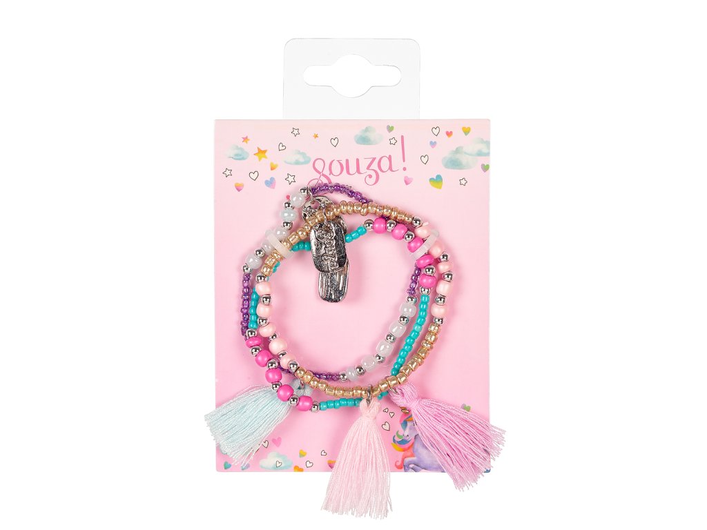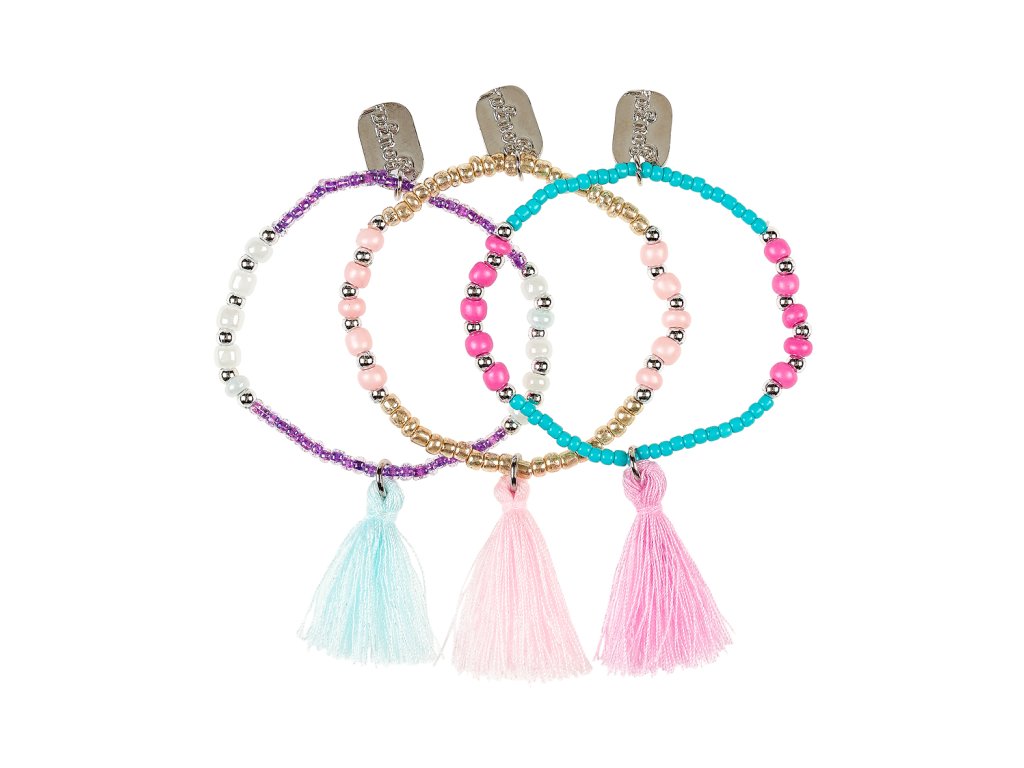 Súprava troch detských náramkov poteší každú malú parádnicu, ktorá má rada hravé a farebné doplnky. Náramky sú navrhnuté tak, aby sa ľahko nosili, boli pohodlné a zároveň vyzerali pôvabne na malom zápästí. Veselé farby skvelo doplnia každodenné oblečenie aj slávnostné šaty. Koráliky sú navlečené na pružnej gumičke, ktorá sa ľahko prispôsobí detskému zápästiu a umožňuje pohodlné nasadenie bez zapínania. Každý z náramkov je dozdobený strapcom.