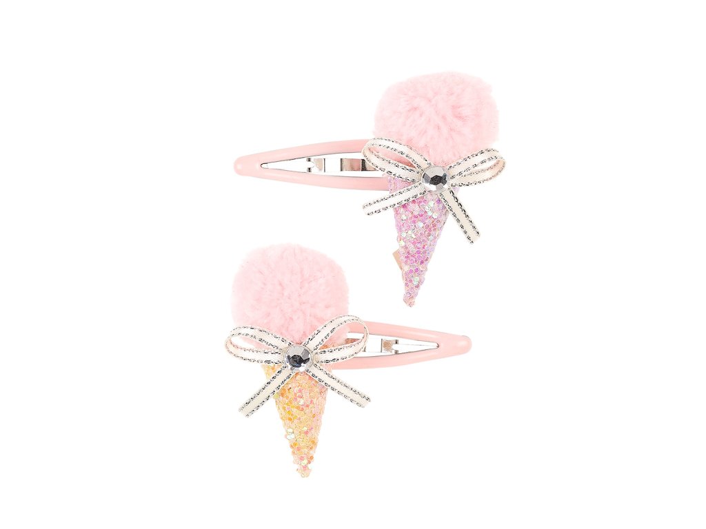 Súprava dvoch sponiek do vlasov s motívom zmrzliny pre malé parádnice od 3 rokov. Sponky sú ozdobené malým kornútikom so zmrzlinou. Trblietavý kornútik, mašľa s lesklým kamienkom uprostred a tylová guľôčka. Vďaka zacvakávaciemu mechanizmu sponky spoľahlivo držia vo vlasoch po celý deň.
