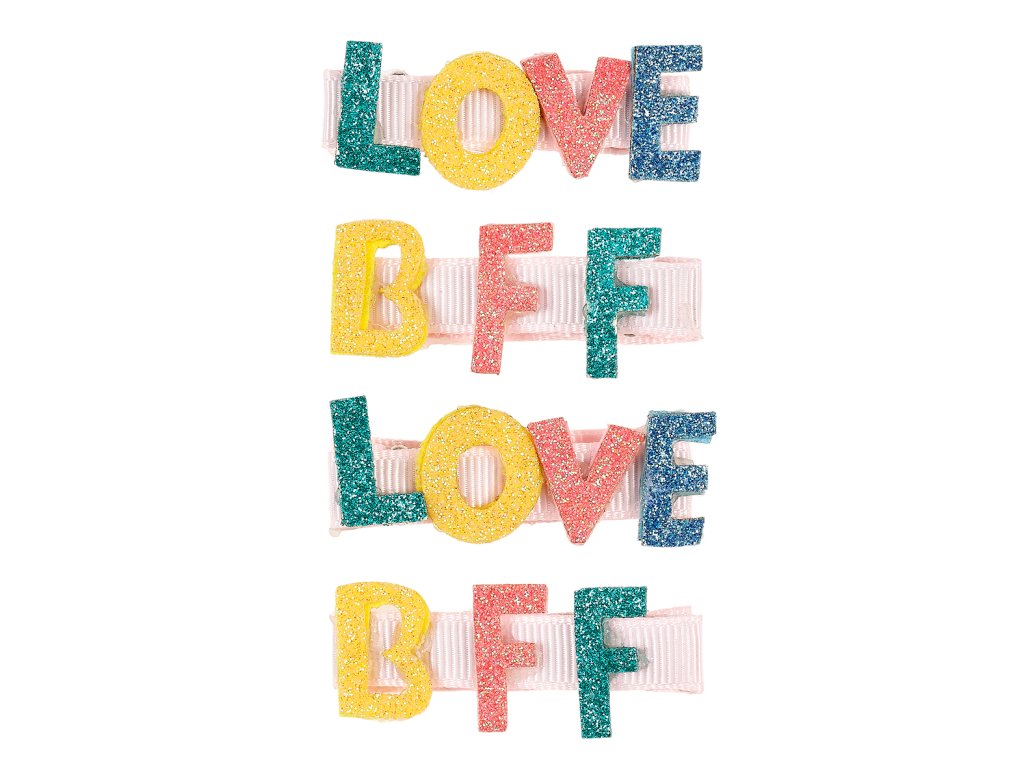 Súprava štyroch roztomilých sponiek s nápismi LOVE a BFF pre malé parádnice od 3 rokov. Kovová časť je potiahnutá rypsovou stuhou. Vďaka jemne vrúbkovanému úchytu držia sponky spoľahlivo vo vlasoch. Hodia sa ako na slávnostné príležitosti, tak pre bežné nosenie. Ideálny nápad aj na malý darček.
