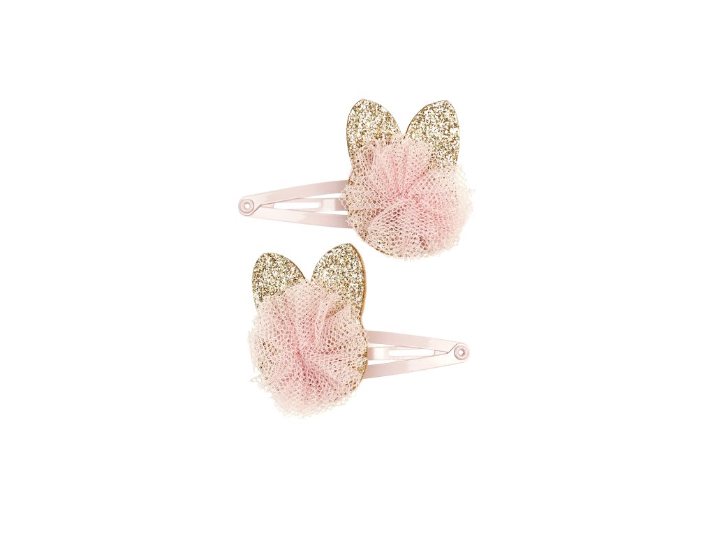 Roztomilé vlasové sponky pre malé parádnice od 3 rokov. Súprava dvoch kovových sponiek s ružovým metalickým leskom. Sponky zdobí zlatá aplikácia v tvare mačičky doplnená ružovým tylovým brmbolcom, nežný detail pre malé romantičky. Vďaka zacvakávaciemu mechanizmu spoľahlivo držia vo vlasoch po celý deň.