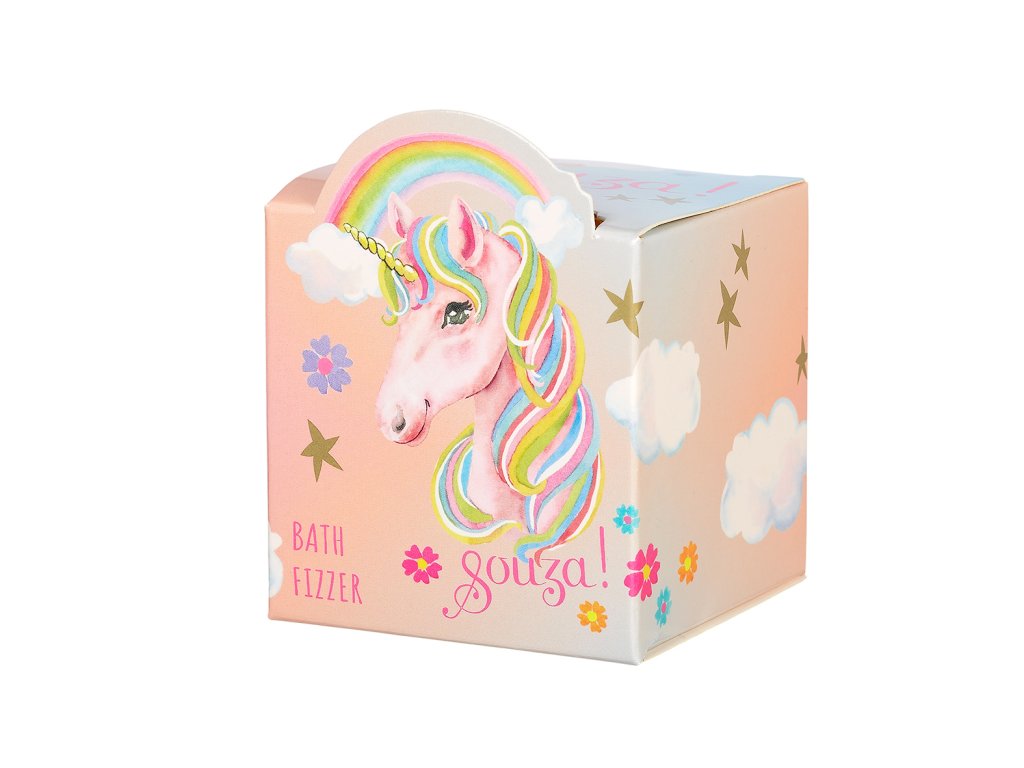 Šumivá bomba do kúpeľa pre deti od 3 rokov v krásnych farbách (tyrkysová-ružová-fialová-oranžová). Dermatologicky testované, bezpečné, hypoalergénne, nedráždivé a nevysušujúce. Ideálne pre večerný relaxačný kúpeľ vo vani. Šumivú bombu možno využiť aj ako malý štýlový darček. Balené v kartónovej škatuľke s ilustráciou jednorožca. Produkt je 100 % vegánsky a netestovaný na zvieratách.Dodatočné parametre