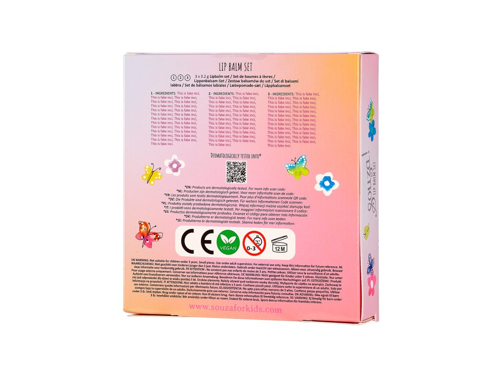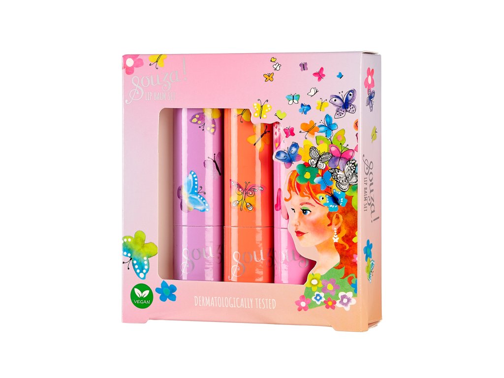 Súprava troch balzamov na pery (fialový, ružový a oranžový) pre deti od 6 rokov v kartónovej škatuľke s priehľadným okienkom. Hodia sa pre každodenné použitie alebo na narodeninovú párty. Základné zložky sú dermatologicky testované, bezpečné, nespôsobujú alergie ani podráždenie pokožky. Produkt je 100 % vegánsky a nebol testovaný na zvieratách.