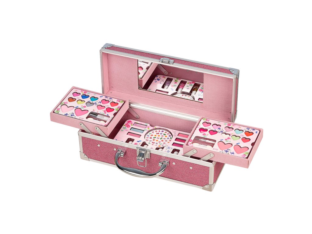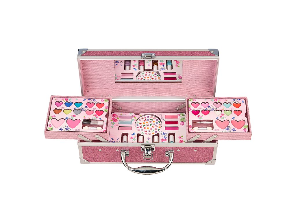 Luxusná dvojposchodová súprava líčenia pre deti je skvelým darčekom pre malé milovníčky krásy a fantázie od 6 rokov. Kufrík so skladacími priehradkami a zrkadielkom ukrýva bohatý výber detskej kozmetiky v nádherných farbách. Obsah súpravy: laky na nechty, krémové rúže, lesky na pery, farebné očné tiene, lícenky, hárok samolepiek na nechty, aplikátory a jemné štetce. Kozmetika je dermatologicky testovaná a šetrná k detskej pokožke. Laky vytvárajú na nechtoch zlupovaciu vrstvu, ktorá sa ľahko odstraňuje bez potreby odlakovača. Rúže aj očné tiene možno jednoducho zmyť teplou mydlovou vodou. Ideálna pre detské párty, narodeninové oslavy alebo hranie na rozprávkové fantasy. Celá súprava je balená v pevnom kartónovom kufríku s kovovým zapínaním a uchom pre ľahké prenášanie.