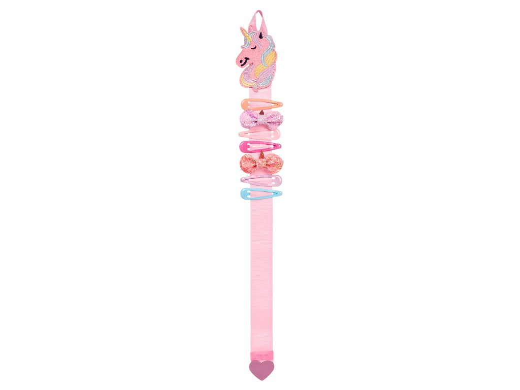 Súprava organizéru a sponiek do vlasov v jemných tónoch ružovej, oranžovej a tyrkysovej pre malé parádnice. Každá sponka je iná – dve zdobené trblietavými mašličkami, zvyšok v jednoduchom, ale elegantnom vyhotovení. Závesný organizér – stužka s aplikáciou jednorožca Sally a praktickým pútkom možno ľahko zavesiť na háčik alebo vešiačik v detskej izbe, kúpeľni či pri toaletnom stolíku. Skvelý spôsob, ako si v sponkách udržať poriadok a mať všetky sponky vždy po ruke.