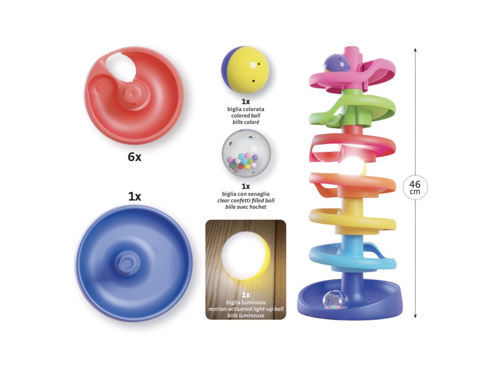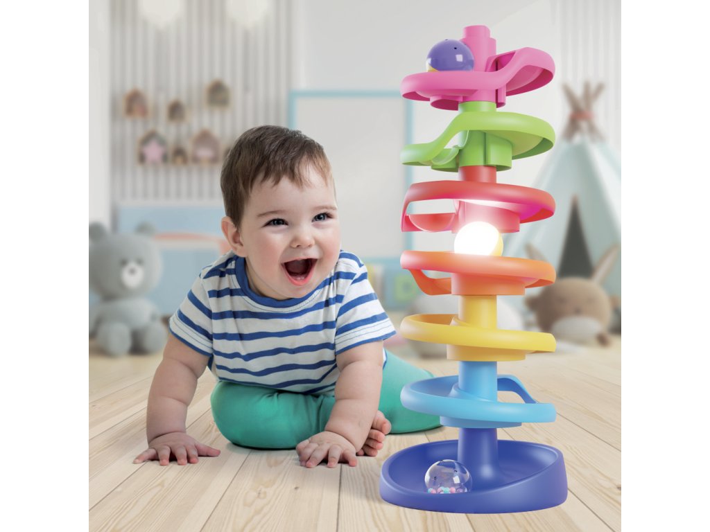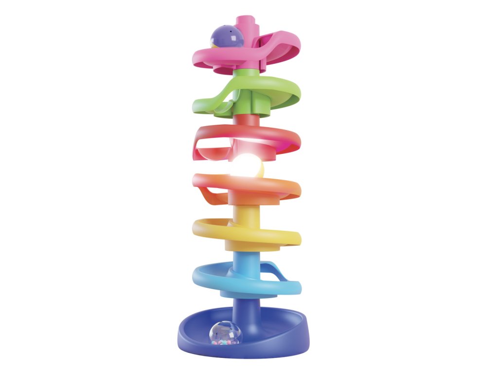 Vysoká špirálová veža pre najmenšie deti od 12 mesiacov ponúka zábavu plnú svetiel, zvukov a pohybu. Tri veľké guľôčky schádzajú dole po farebnej dráhe a svištia ako blesk. Jedna z guľôčok chrastí a druhá sa pohybom rozsvieti. Deti sledujú, čo sa deje, keď guľôčku pustia na dráhu, a pritom si rozvíjajú jemnú motoriku, koordináciu oko-ruka i chápanie príčiny a následku. Hračka je stabilná, bezpečná a ľahko sa skladá.