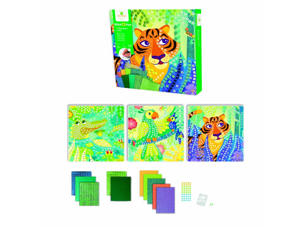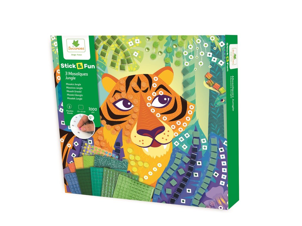 Objavte čaro mozaiky s touto kreatívnou súpravou, ktorá deťom od 5 rokov prinesie množstvo zábavy a zároveň podporí ich jemnú motoriku, koordináciu oko-ruka i vnímanie farieb a tvarov. Deti si dotvoria tri nádherné obrázky zvierat z džungle pomocou samolepiacich kamienkov a mozaikových dielikov. Každý detail dodá ich výtvoru jedinečný lesk a po dokončení si deti môžu svoje diela hrdo vystaviť – stačí ich zavesiť na priložené priehľadné závesy. Balenie obsahuje: 3 štvorcové obrázky na pevnom kartóne (22 x 22 cm), 1 000 samolepiacich dielikov na dekoráciu, 3 priehľadné závesy na zavesenie obrázkov, farebný návod. Rozmery balenia: 24 x 24 x 4 cm. Odporúčané pre deti od 5 rokov. Táto kreatívna súprava je skvelým spôsobom, ako si deti môžu rozvíjať fantáziu a motoriku a zároveň si užívať radosť z tvorenia!Dodatočné parametre
