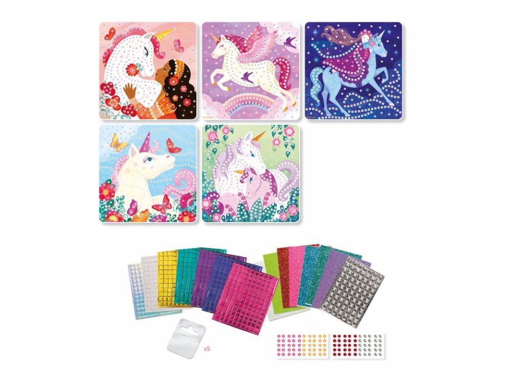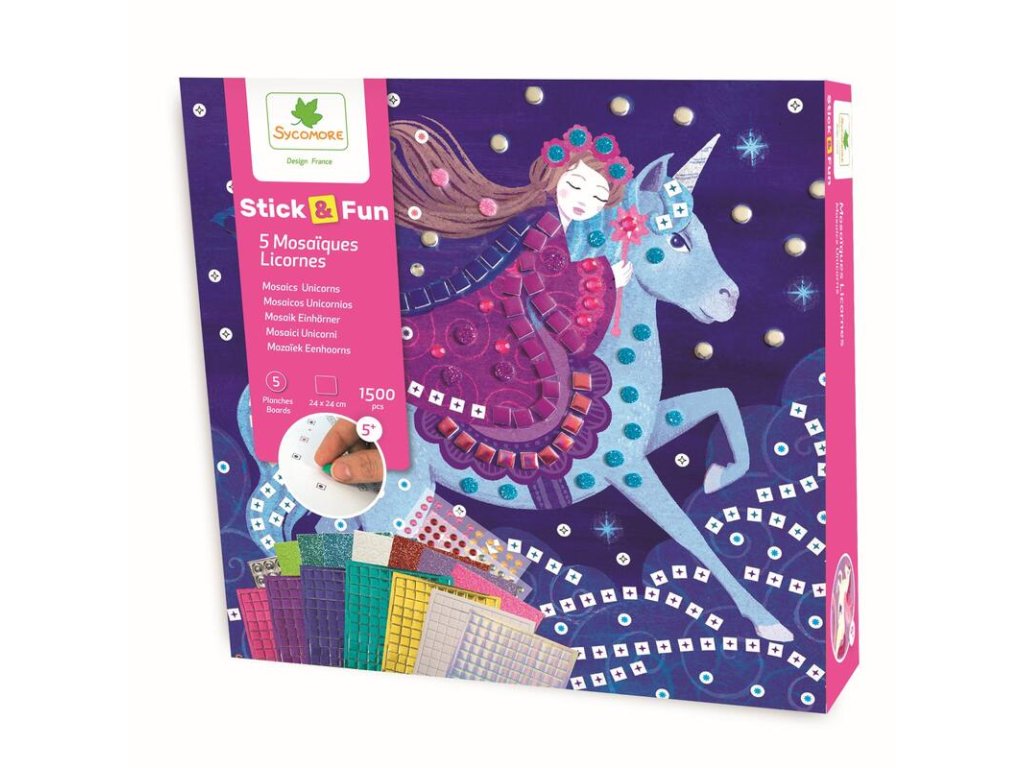Kreatívna voľnočasová aktivita pre deti od 5 rokov. Deti si pomocou penových dielikov dozdobia 5 efektných obrázkov s obľúbenými jednorožcami. Postupujte podľa návodu a postupne dolepujte do obrázku farebné mozaikové tvary a potom kamienky, ktoré obrázkom dodajú lesk. Po dokončení obrázkov môžete nalepiť háčik na zadnú stranu a zavesiť hotové dielko na stenu v detskej izbičke. Zdobenie mozaikou je zábava, ktorá rozvíja jemnú motoriku, koncentráciu a trpezlivosť vášho dieťaťa. Obsah balenia: 5 obrázkov na pevnom kartóne 24 x 24 cm, 1 500 mozaikových dielikov a trblietavých kamienkov, 5x priehľadný záves a farebný návod krok za krokom. Rozmery škatule: 26 x 26 x 5 cm.Dodatočné parametre