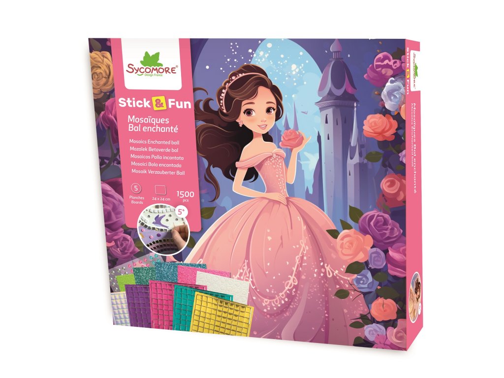 Obsah balenia: 5 obrázkov na pevnom kartóne 24 x 24 cm, 1 500 mozaikových dielikov a trblietavých kamienkov, 5x priehľadný záves a farebný návod krok za krokom.