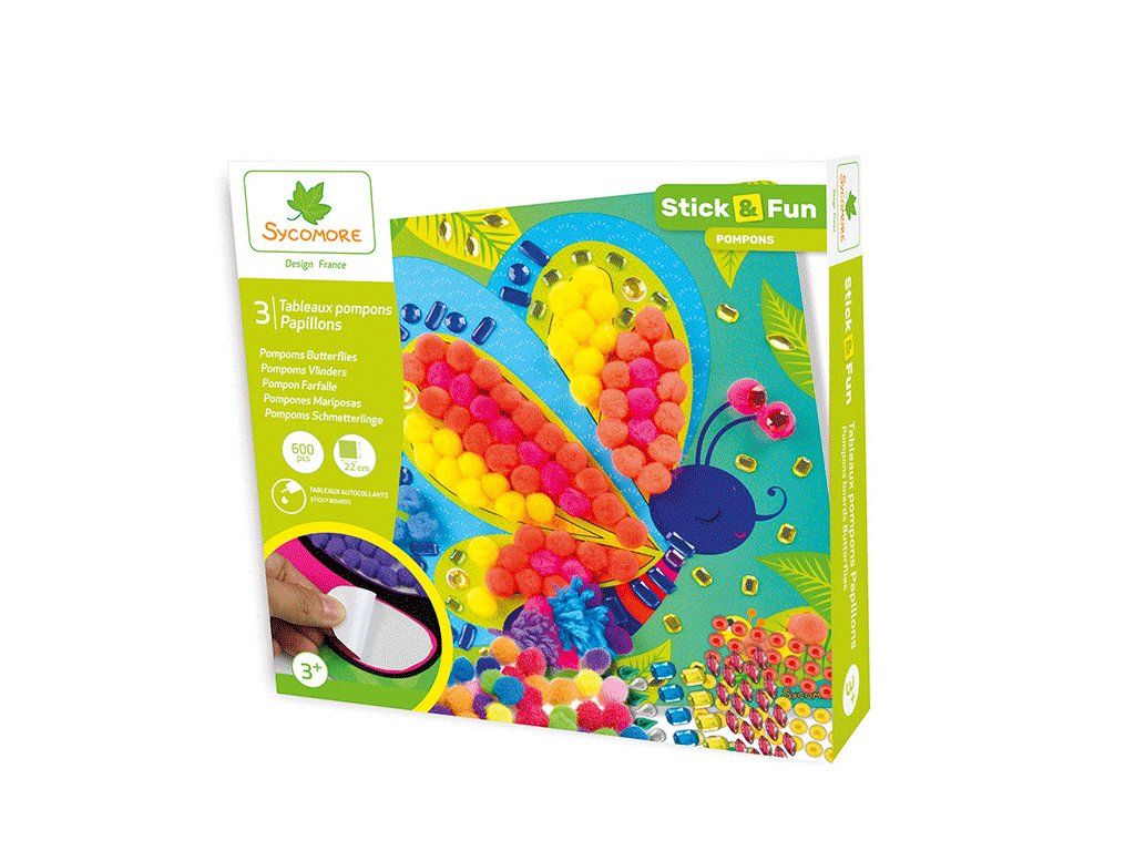 Kreatívna súprava pre deti od 3 rokov. Deti si dotvoria pomocou farebných brmbolcov a samolepiacich kamienkov tri obrázky s motívmi motýľov na kvalitnom kartóne. Po dokončení obrázkov môžete nalepiť háčik na zadnú stranu a zavesiť hotové dielko na stenu v detskej izbičke. Aktivita je vhodná na precvičenie farieb a tvarov, jemnej motoriky a koordinácie oko-ruka. Balenie obsahuje: 3 obrázky (22 x 22 cm) na dotvorenie, 600 farebných brmbolcov, samolepiace kamienky, 3 háčiky na zavesenie hotových obrázkov a návod. Rozmery balenia: 24 x 24 x 4 cm. Vďaka tvorivým súpravám Sycomore si deti rozvíjajú svoje schopnosti a užívajú si hodiny kreatívnej zábavy bez mobilov a tabletov!Dodatočné parametre