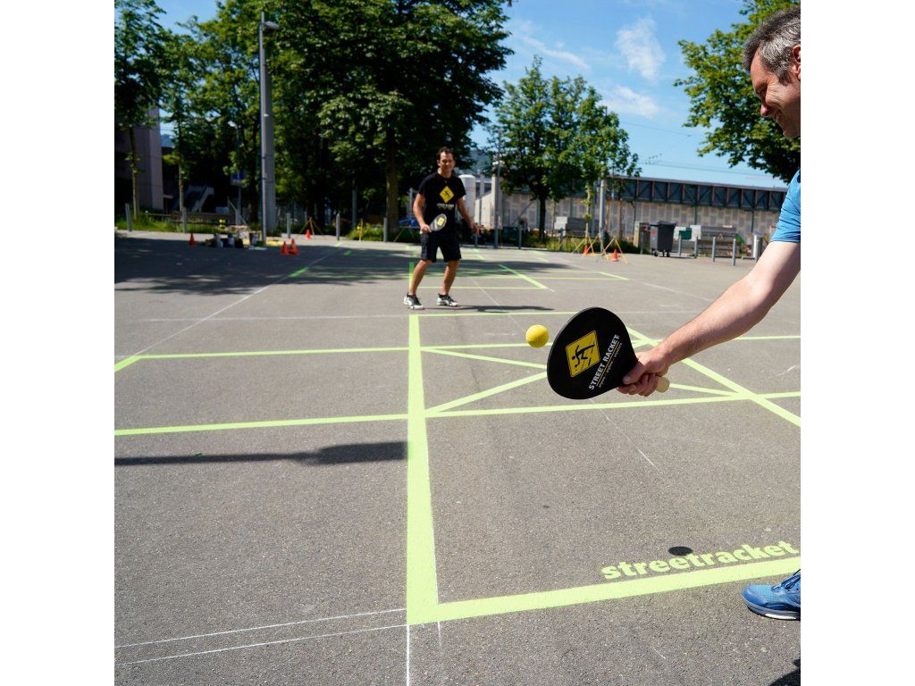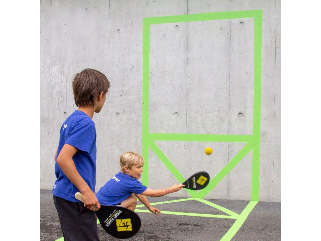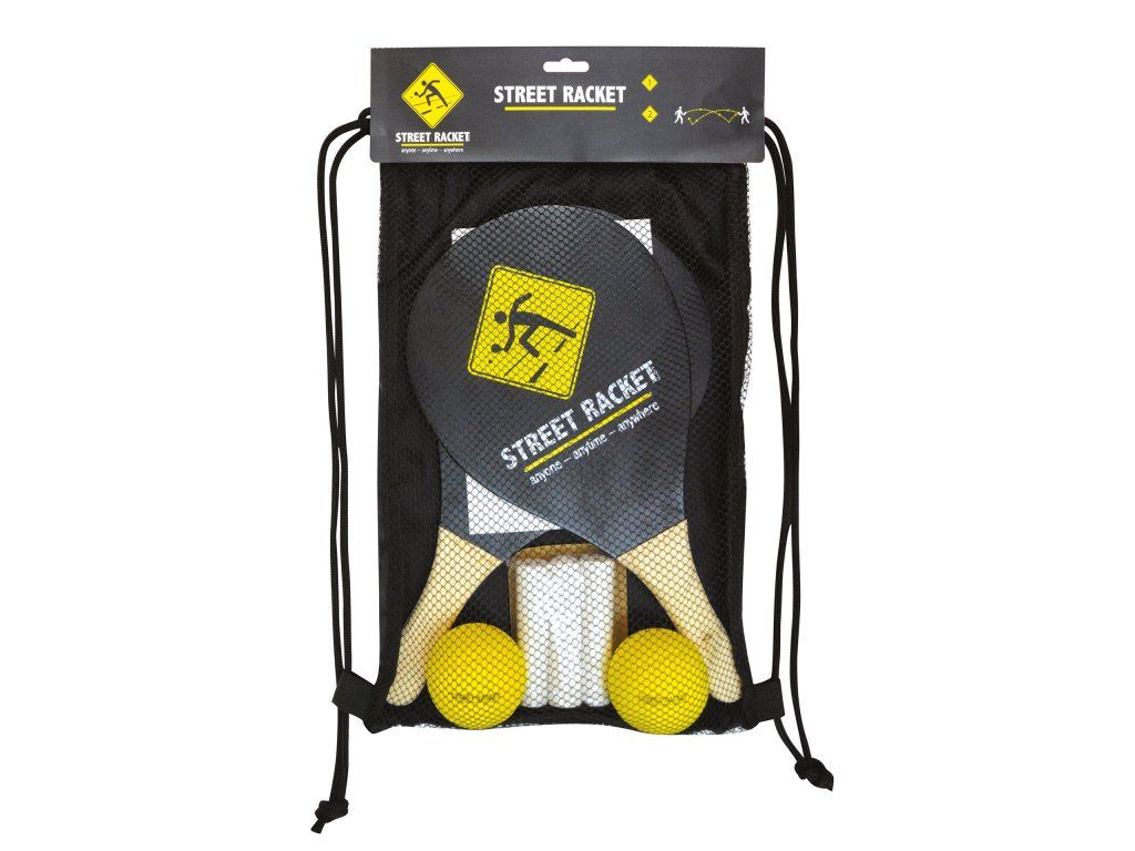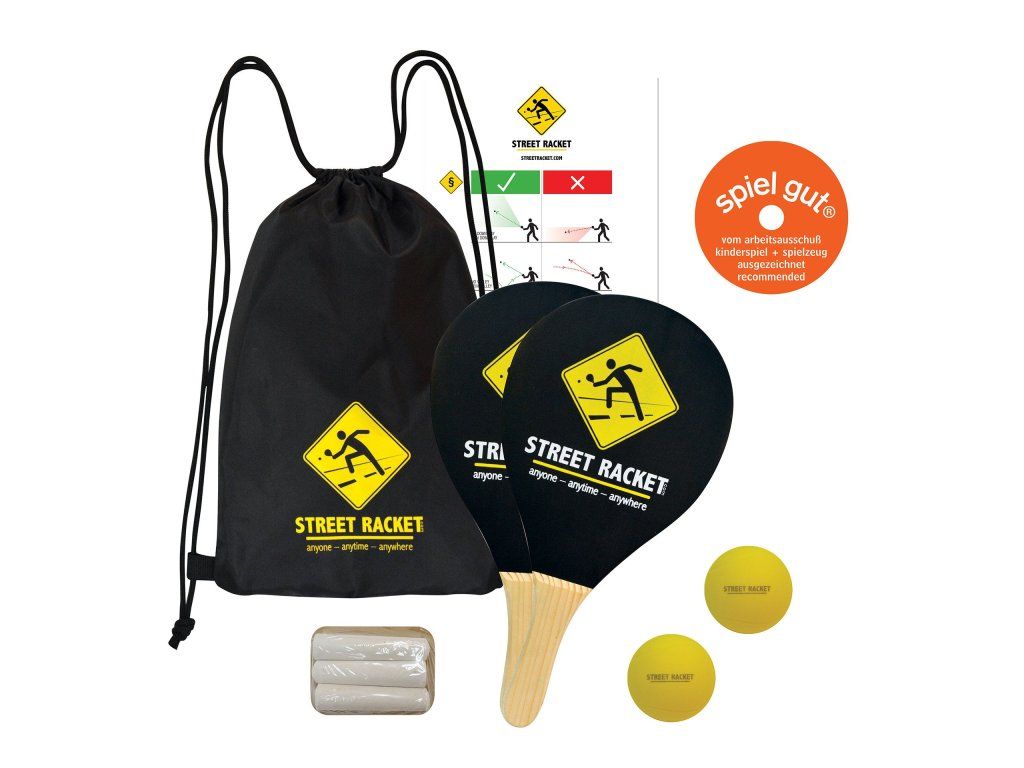 Street Racket je nový raketový šport vyvinutý vo Švajčiarsku, ktorý možno hrať kedykoľvek a kdekoľvek, bez nutnosti zložitej infraštruktúry – stačí si vyznačiť kriedou kurt, napríklad na ihrisku alebo na parkovisku, a ste pripravení! Na pláži, v snehu, na chodbe, v kancelárii – Street Racket možno hrať kdekoľvek! Túto novú pohybovú hru možno cvičiť samostatne, vo dvojiciach alebo v skupinách a užiť si množstvo zábavy. Rýchle úspechy poskytujú množstvo motivácie a rýchly pokrok. Súprava Street Racket sa skladá z 2 čierne natretých drevených rakiet (38 x 20 x 1,8 cm) s logom, rukoväťou z prírodného dreva, 2 mäkkých loptičiek – porézna pena s veľmi dobrým odrazom, 70 mm, 3 značiek ihriska, návodu, všetko v čiernej športovej taške s potlačeným logom a sťahovacou šnúrkou. Rozmery: 37,8 x 23,5 x 6 cm Hmotnosť: 0,49 kg