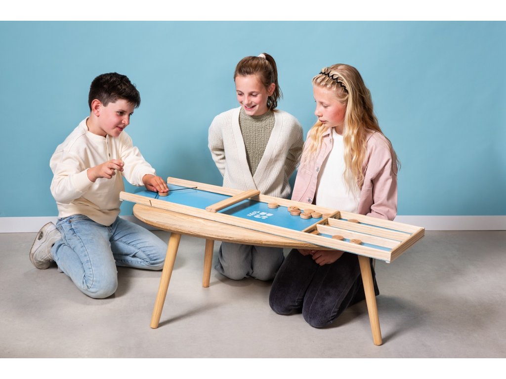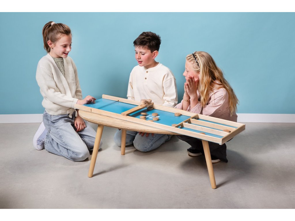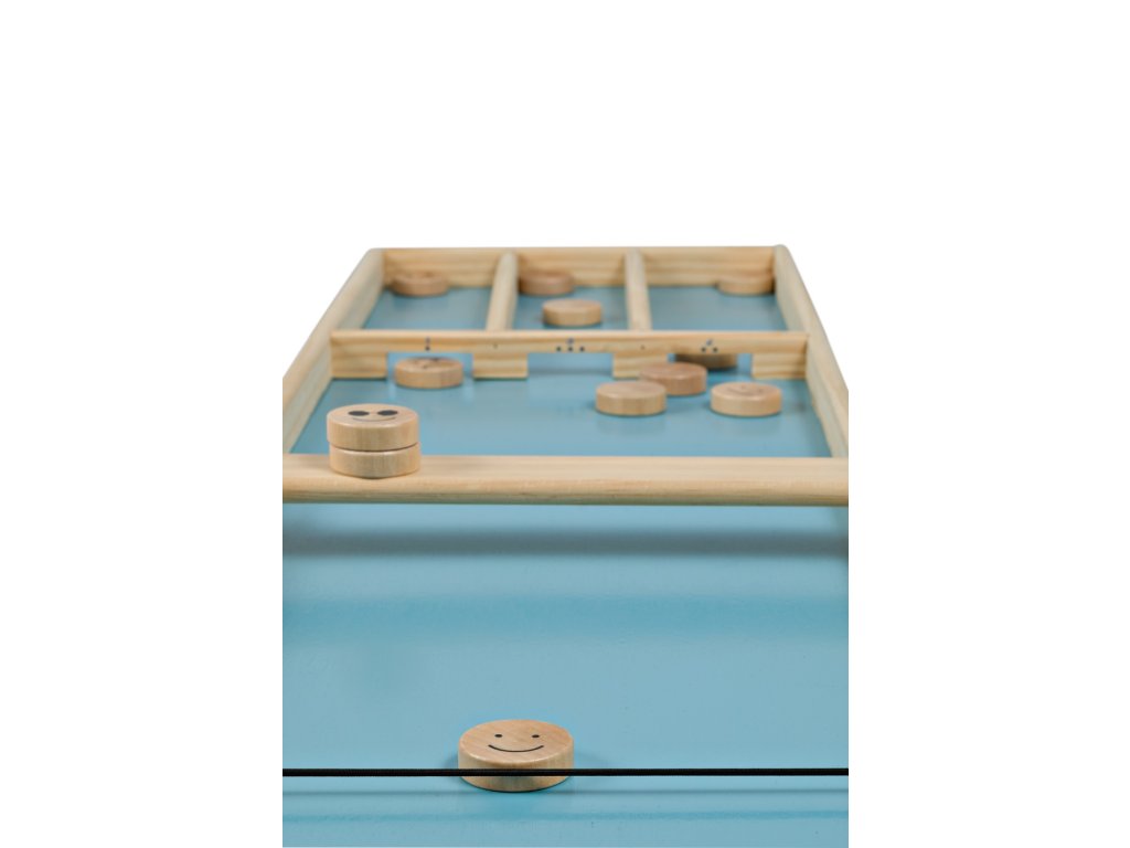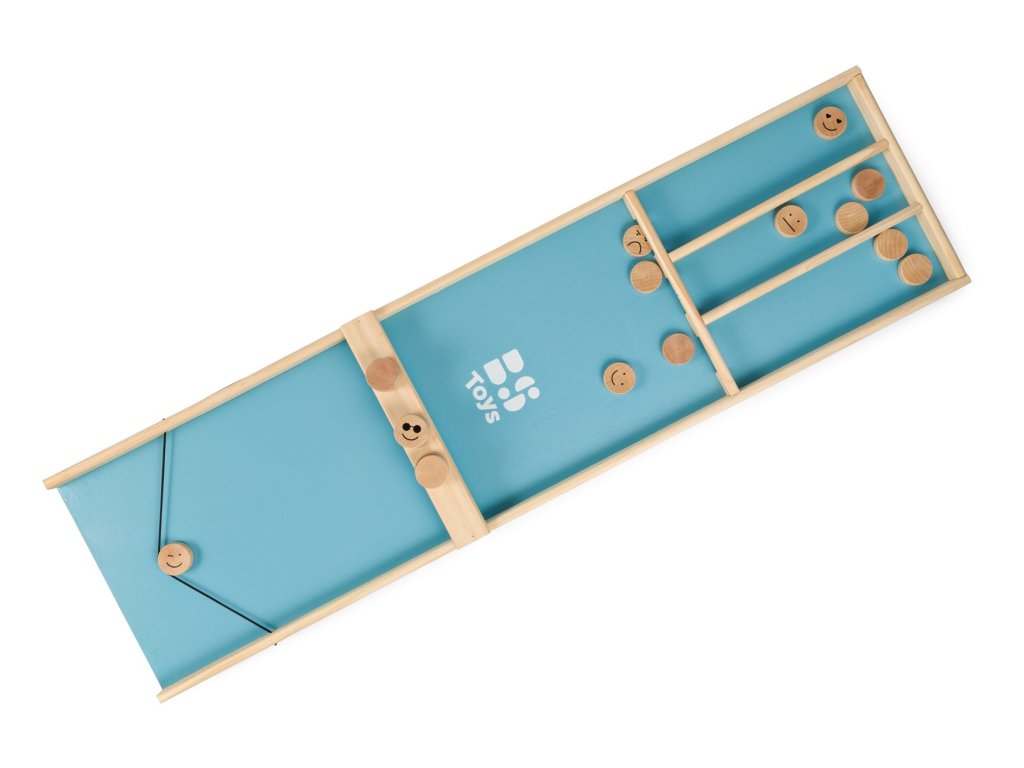 Zábavná posúvacia hra pre 1 až 4 hráčov od 4 rokov. Hráči striedavo posúvajú alebo vystreľujú drevené žetóny po drevenej doske smerom k otvorom s rôznymi bodovými hodnotami. Cieľom je dostať čo najviac pukov do otvorov na hernej doske a získať za ne čo najväčší počet bodov. Hrá sa na tri kolá – zakaždým sa znovu skúšajú tie puky, ktoré minule neprepadli. Puky môžete posúvať rukou alebo ich vystreľovať pomocou gumičky. Puky s tvárami majú dvojnásobnú hodnotu, takže každý zásah sa počíta!