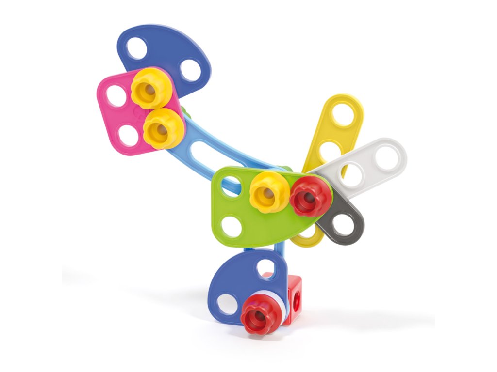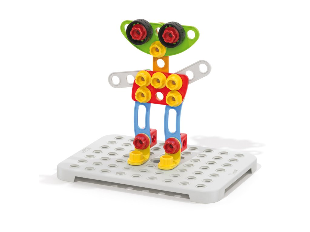 Skrutky, matice, krídlové matice, kolesá a perforované dielce z odolného, netrieštivého plastu je možné zostavovať bez použitia akéhokoľvek náradia. Deti budú potrebovať len svoje ruky a predstavivosť. Táto súprava totiž obsahuje všetko, čo je nevyhnutné na zostrojenie robotov, zvierat alebo čohokoľvek ďalšieho. Vďaka perforovanej podložke je možné zostavovať horizontálne i vertikálne konštrukcie. Stavebnica Tecno Jumbo starter set rozvíja koordináciu, logické myslenie i tvorivosť a zábavnou formou pomáha deťom pochopiť základné princípy mechaniky.