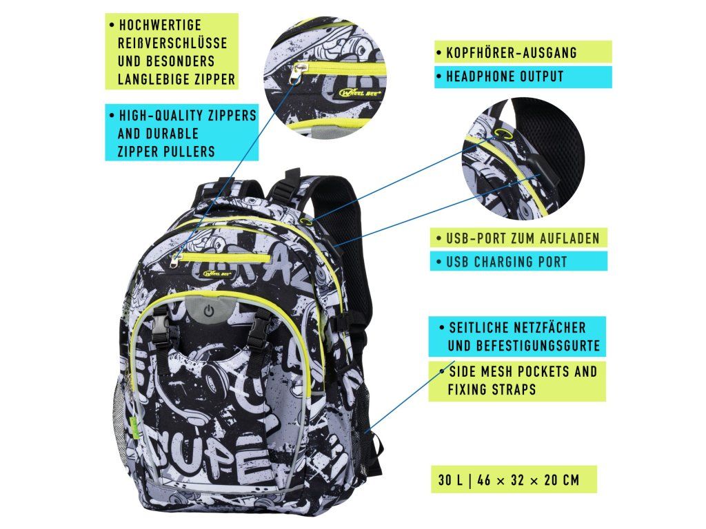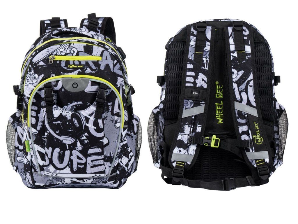 Inovativní a moderní batoh do školy, na univerzitu, do kanceláře nebo na volný čas s integrovaným LED osvětlením pro maximální bezpečnost a viditelnost. 3funkční přepínač: trvalé svícení, rychlé blikání, pomalé blikání. Batoh s polstrovanými zády, nastavitelnými polstrovanými ramenními popruhy a zesíleným dnem nabízí bezkonkurenční vybavení a nadčasový a moderní design. Batoh je vybaven LED světlem (zelené - zelené světlo je viditelné obzvláště daleko) a dalšími reflexními proužky a nabízí tak maximální viditelnost a bezpečnost za soumraku a ve tmě. Dvojitý pogumovaný povlak pro větší odolnost a ochranu před vlhkostí. Zadní systém cirkulace vzduchu. Batoh je vybaven USB portem pro nabíjení mobilního telefonu (připojovací kabel je součástí balení), výstupem pro sluchátka, 2 hlavními přihrádkami, 1 menší přihrádkou, 2 skrytými přihrádkami proti krádeži, přihrádkou na notebook (40 x 28 x 3,5 cm), 2 přihrádkami na powerbanky, organizérem na drobnosti, rukojetí, výškově nastavitelným hrudním popruhem s píšťalkou pro případ nouze, bederním pásem, vnějšími síťovanými kapsami, bočními popruhy na svetry a držákem na brýle. Vysoce kvalitní zip SBS. Vyměnitelné baterie (2 ks CR2032) jsou součástí balení. Před prvním použitím odstraňte pojistku kontaktů baterie (průhledná fólie na vypínači). Předpokládaná životnost baterií: cca 100 hodin. Proč Wheel Bee používá zelené LED světlo místo jiných barev? Lidské oko vnímá barvy s vlnovými délkami od přibližně 400 nanometrů (fialová) do 700 nanometrů (červená). Tento rozsah od 400 do 700 nanometrů se nazývá viditelné světlo nebo viditelné spektrum. Lidské oko je nejcitlivější na střední rozsah tohoto spektra – kolem 555 nanometrů. Zelené světlo má tuto vlnovou délku, což z něj činí nejviditelnější barvu pro člověka. Parametry: • Rozměry: 46 x 32 x 20 cm • Objem cca 30 litrů • Maximální nosnost: 20 kg • Hmotnost 0,98 kg Nejedná se o osobní ochranný prostředek (OOP) v souladu s nařízením (EU) 2016/425. Určeno pouze pro sportovní a rekreační použití. Neposkytuje žádnou ochranu před zdravotními nebo bezpečnostními riziky.